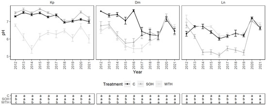 From 2012 to 2021, the mean soil solution pH of the Kp site was 7.0 ± 0.1: 7.2 ± 0.1 for the control, 7.4 ± 0.1 for CH and 6.3 ± 0.1 for WTH (Figure 4). The mean pH during the vegetation season was significantly lower for WTH than for CH or the control (p < 0.01) (Figure A1). The mean pH in the vegetation season for CH was similar to the control, except in 2012, 2016 and 2020 (p < 0.03). The mean pH of the soil solution from the Dm site was 6.5 ± 0.1: 7.0 ± 0.2 for the control, 6.4 ± 0.2 for CH and 6.2 ± 0.1 for WTH. The mean pH during the vegetation season was significantly lower for CH and WTH than for the control from 2013 to 2016 (p < 0.04). In 2017, the mean pH was significantly lower for WTH than for the control (p = 0.01) or CH (p = 0.03). Since 2018, the mean pH values in the control, CH and WTH were similar. The mean pH of the Ln site was 6.3 ± 0.1: 6.5 ± 0.1 for the control, 5.8 ± 0.2 for CH and 6.6 ± 0.1 for WTH. The mean pH during the vegetation season was significantly lower for CH than for WTH and the control from 2013 to 2019 (p < 0.01). No pronounced differences were observed between the 30 and 60 cm sampling depths in all plots at all sites, except for CH at the Kp site, where the mean pH during the vegetation season was often lower at the 30 cm than at the 60 cm sampling depth (Figure A5).