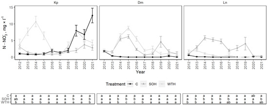 N-NO3− concentrations in soil solution in control (C), stem-only harvesting (SOH) and whole-tree harvesting (WTH) plots at the study sites. Error bars represent standard error; different letters (a, b, c) indicate statistically significant differences (p < 0.05) between treatments.