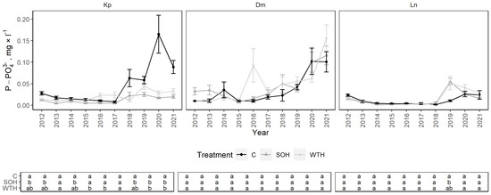 Generally, P-PO43− concentrations in all three sites were low and showed no clear effect of harvest intensity (Figure 6). From 2012 to 2021, the mean P-PO43− concentration at the Kp site was 0.03 ± 0.01 mg·L−1: 0.05 ± 0.02 mg·L−1 for the control, 0.01 ± 0.00 mg·L−1 for CH and 0.02 ± 0.00 mg·L−1 for WTH. In the latest years of observations (2018–2021), P-PO43− concentrations increased for the control with the partial collapse of the stand, reaching significantly higher concentrations than for CH from 2019 to 2021 (p < 0.01) and WTH from 2020 to 2021 (p < 0.01) (Figure A3). The effect was more pronounced at the 60 cm than at the 30 cm sampling depth (Figure A7). P-PO43− concentrations for the control were significantly higher at the 60 cm than at the 30 cm sampling depth, by 0.03 mg·L−1, on average, during all study years except 2017. P-PO43− concentrations were significantly lower for CH than for the control in 2012, 2013 and 2015 (p < 0.01). P-PO43− concentrations were significantly higher for WTH than CH or the control in 2016 and 2017 (p < 0.01). The mean P-PO43− concentrations at the Dm site tended to increase in the latest years (2020–2021) in all plots. The only statistically significant difference at the Ln site was observed in 2019, when the mean P-PO43− concentration increased slightly for CH compared to the control (p = 0.05).