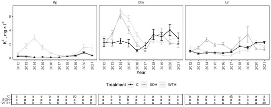 From 2012 to 2021, The mean K+ concentration at the Kp site was 0.54 ± 0.12 mg·L−1: 0.24 ± 0.07 mg·L−1 for the control, 0.24 ± 0.06 mg·L−1 for CH and 1.15 ± 0.26 mg·L−1 for WTH (Figure 7). Significantly higher mean K+ concentrations were observed for WTH from 2012 to 2017 compared to CH and the control (p < 0.04) (Figure A4). In 2012, the mean K+ concentration was significantly higher for WTH than for CH or the control, but less pronounced than during the peak. In 2018, K+ concentrations stabilised and were statistically similar in all plots. WTH had significantly higher mean K+ concentrations compared to CH from 2019 to 2021 (p < 0.02) and the control from 2020 to 2021 (p < 0.05).
