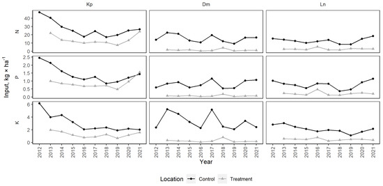The mean N input with litter during the vegetation season was 18.55 ± 1.63 kg·ha−1 in control stands and 6.01 ± 1.25 kg·ha−1 in the harvested plots (Figure 8). The N input ranged from 8.26 (Ln 2019) to 47.30 (Kp 2012) kg·ha−1 in control stands and from 0.39 (Dm 2016) to 23.89 (Kp 2021) kg·ha−1 in the harvested plots. The mean P input was 1.00 ± 0.08 kg·ha−1 in control stands and 0.38 ± 0.08 kg·ha−1 in the harvested plots. The P input ranged from 0.36 (Ln 2018) to 2.46 (Kp 2012) kg·ha−1 in control stands and from 0.03 (Dm 2019) to 1.55 (Kp 2021) kg·ha−1 in the harvested plots. The mean K input was 2.82 ± 0.22 kg·ha−1 in control stands and 0.67 ± 0.10 kg·ha−1 in the harvested plots. The K input ranged from 1.10 (Ln 2019) to 6.17 (Kp 2012) kg·ha−1 in control stands and from 0.07 (Dm 2016) to 1.98 (Kp 2013) kg·ha−1 in the harvested plots.