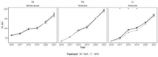 Mean regenerated stand height after stem-only harvesting (SOH) and whole-tree harvesting (WTH) at the study sites. Error bars represent standard error; stars indicate statistically significant differences (p < 0.05) between treatments.