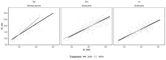 Harvesting of the entire above-ground tree biomass (hereafter referred to as whole-tree harvesting or WTH, as opposed to stem-only harvesting or SOH, where only tree stems are extracted and branches and treetops are left on site) presents opportunities as well as risks. Leaving fresh logging residues on site can attract pests, such as European spruce bark beetle (Ips typographus) [7], and increase fire risk [8,9]. Moreover, removing treetops and branches can reduce site preparation costs [10]. Some methods integrate logging residue removal and site preparation in one operation, thus reducing the use of heavy machinery [11]. However, whole-tree harvesting poses several concerns related to forest productivity, such as depletion of nutrient pools [12,13,14] and reduced nutrient availability [15], especially in poor soils. Compared to stem-only harvesting, whole-tree harvesting reduced the tree diameter of Sitka spruce [16] and reduced the mean annual increment of the young stand [17]. Sites with rich nutrient pools and no evidence of affected young stand growth at present may suffer long-term effects on site productivity if whole-tree harvesting is repeated [18]. However, several studies indicate that whole-tree harvesting enhances the growth of young trees [19,20,21], likely due to improved microclimate and seedling survival. The results may differ for conifers and broadleaves; for example, Roxby and Howard [22] detected no significant difference in the dimensions and biomass of hardwoods after whole-tree harvesting.