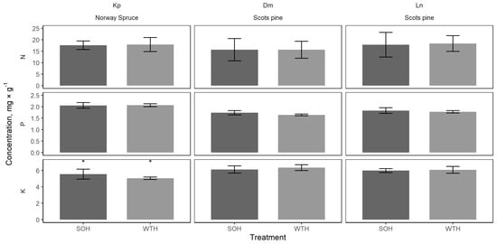 Nutrient (N, P, K) content in current-year needles of dominant tree species of regenerated stands in stem-only harvesting (SO) and whole-tree harvesting (WTH) plots at the study sites (sampled in 2018 and 2019). Error bars represent standard error; stars indicate statistically significant differences between treatments (p < 0.05).