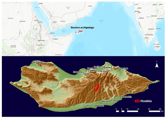 Roqeb di Firmihin (referred to as “Firmihin” in this paper), is a limestone plateau surrounded by deep canyons in the center of the island Socotra, the main island of the Socotra Archipelago (Yemen). The canyons create a relatively isolated area just south of the higher granite mountains (Figure 1). The plateau is gently inclined to the south and is covered by a typical karstic surface of an average altitude of 638 m. a.s.l. According to a recent study [11], this small plateau occupies only 2% of the total suitable area currently occupied by the endemic Dragon’s Blood Trees of Socotra, yet it hosts more than 40% of the population.