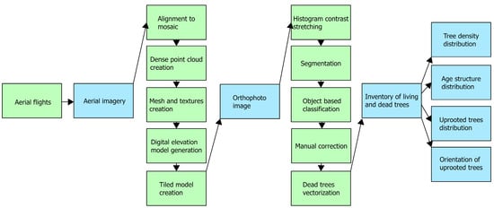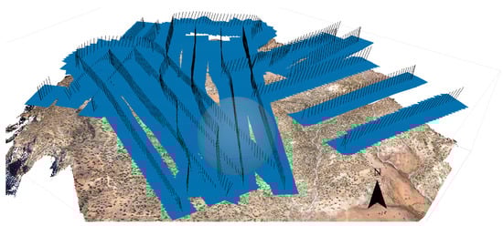Aerial images were assembled into an orthophoto mosaic using Agisoft Metashape software (Agisoft LLC, St. Petersburg, Russia). In total, 4849 georeferenced photos were produced and processed. The images were aligned into the mosaic using an automated control point identification. A dense point cloud consisting of 32,310,160 points was created and were covered by a mesh and textures to generate a custom digital elevation model (DEM). The textured DEM was processed as a tiled model, which was used to produce the final orthophoto image (Figure 3).