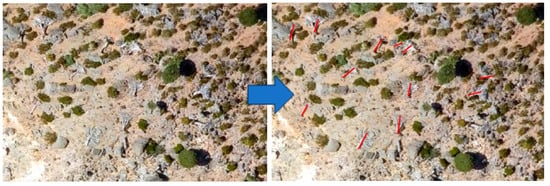 The arid weather conditions on the Firmihin plateau significantly slow down the decomposition of uprooted trees. Most of the dead trees are a direct result of extreme weather events when cyclones hit Socotra in November 2015, affecting the Firmihin forest [1]; the remnants of a fallen Dragon Tree will stay on the ground for years. Dead uprooted trees were identifiable from our high spatial resolution orthophoto image (Figure 4). During the process of manual correction of the tree inventory, dead uprooted trees were also vectorized. We manually added a linear vector layer for each dead tree, oriented from the root section to the crown section, to indicate the direction of the fall (Figure 4).