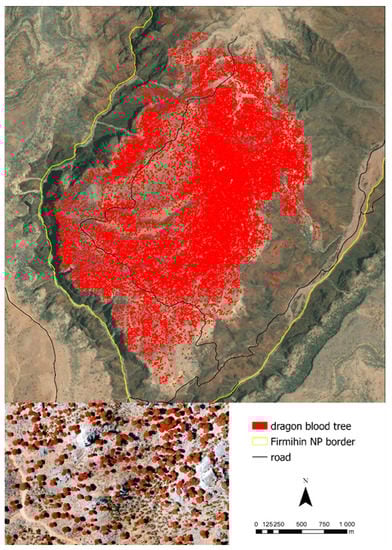 - Adolt, R.; Maděra, P.; Abraham, J.; Čupa, P.; Svátek, M.; Matula, R.; Šebesta, J.; Čermák, M.; Volařík, D.; Koutecký, T.; et al. Field survey of Dracaena cinnabari populations in Firmihin, Socotra Island: Methodology and preliminary results. J. Landsc. Ecol. 2013, 6, 7–34. [Google Scholar] [CrossRef]
