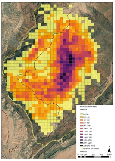 Spatial distribution of Dracaena tree density in Firmihin (individual trees/ha).
