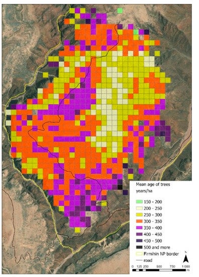 Based on this equation and the size of the crowns as estimated from the orthophoto, the number of branch sections was calculated for every single tree, which was then used to extrapolate the age of the trees. The spatial structure of the age distribution of the Firmihin forest was calculated as the average age of the trees per hectare of the area of interest.