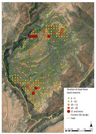 In total, we counted 2123 dead trees, totaling 5.6% of the entire Dracaena population. We can expect that some of the dead trees were entirely decayed and therefore not visible on our orthophoto seven years after the major cyclone event that affected Firmihin. Therefore, the direct effect of the cyclones in November 2015 could exceed 5.6% of the population, but also some trees may have been uprooted later. In addition, many of the remaining (standing) trees are damaged (parts of the crown missing) and dying, yet they were counted here still as living. Such a relatively high number of trees killed by a single disturbance event could substantially decrease the survival time in Dracaena cinnabari extinction models [11,33,34].