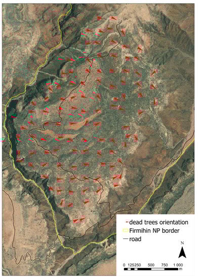 Uprooted trees and their remnants were vectorized on the orthophoto image for the entire Firmihin plateau (Figure 4). In total, 2123 dead trees were vectorized. The highest number of uprooted trees are located at the northwestern and southwestern edges of the forest; the occurrence of dead trees (Figure 9) is less in relatively younger and denser parts of the forest (Figure 7 and Figure 8) in the central-eastern section.