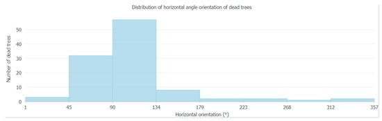 Relative to the cardinal points, a generally eastern direction prevails among the fallen trees (Figure 10). In the northern part of the forest, dead trees are oriented in a southeastern direction, and in the southern parts of the forest, they are oriented towards the northeast. In total, uprooted trees have a northeastern, eastern, or southeastern orientation with a range of horizontal angles between 22.5° and 157.5° in 91% of the entire area of Firmihin (Figure 10 and Figure 11).