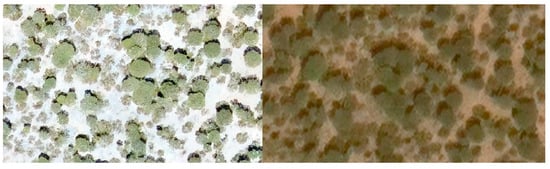Several inventories in the past applied other methods to estimate the size of the Socotran Dracaena forest. In 2010, statistical methods were used to perform the first forest inventory in Firmihin using randomly selected circular plots with a diameter of 25 m [26]. In total, 1992 individual Dragon trees were directly measured inside the predefined sample plots. The database was statistically extrapolated for the entire Firmihin forest with an estimation of 66,054 trees (with 14,500 trees as a 95% error) in total. Although this forest inventory was carried out before the cyclones that affected the forest in 2015, the total number of Dracaena trees in the latter study is almost two times our estimation. A more recent inventory used remote sensing analysis of Google Earth and ESRI orthophoto images [11], identifying 32,086 individual Dracaena trees in Firmihin, which is very similar to the estimation in our study. These previous estimations provide valuable information about the area of interest; however, the current UAV inventory allowed us to create an orthophoto with a higher resolution in comparison to the Google and ESRI orthophotos (Figure 12). The current results are more accurate, not only in estimating the number of trees, but also allowing some specific tree attributes such as individual crown area estimation and, therefore, the age structure of the forest, and to investigate mortality.