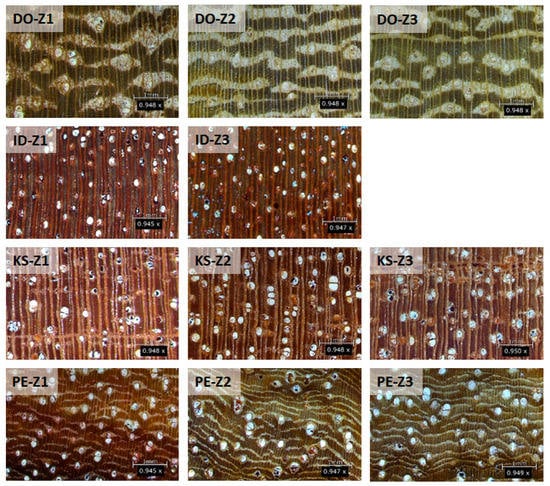 Once at the laboratory, for different analytical purposes, each cross-section was divided into two identical parts along the radial direction. The first part was prepared following standard dendrochronological methods to improve the visibility of the growth rings and related macroscopic and microscopic features. The wood surface was manually polished with fine sandpaper (grain sizes from P600 to P1200, Federation of European Producers of Abrasives). This first part enabled us to obtain images of transverse sections, using a Leica Emspira 3 digital microscope (Leica Microsystems GmbH, Wetzlar, Germany), as presented in Figure 2. As for the second part, in the first step, it was divided along the radial direction into small pieces of 3 to 4 cm. Thereafter, a portion (10–15 g) of each wood piece was milled to a very fine powder and homogenized using a Retsch mixer mill MM 301 (Retsch GmbH, Haan, Germany), with final fineness <5 µm, and oven dried at 30 °C for two weeks before the analysis using CIELab color space and infrared spectroscopy techniques. It is worth mentioning that the main reason for milling the wood to very fine powder is related to the later application of the X-ray fluorescence techniques to determine the elemental concentrations, not to the color measurement nor the infrared spectroscopy technique.