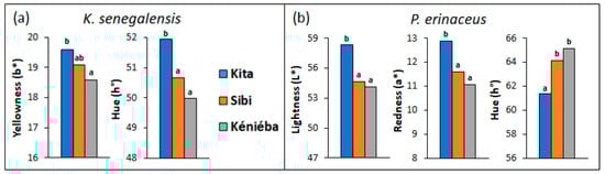 Bar chart of the mean values of color parameters showing significant differences between samples from the three areas; (a) for K. senegalensis (n = 8 for Kita, n = 8 for Sibi and n = 8 for Kéniéba), (b) for P. erinaceus (n = 6 for Kita, n = 5 for Sibi and n = 6 for Kéniéba); (the labels a, ab, and b refer to group classification in ascending order of the Student–Newman–Keuls post-hoc test).