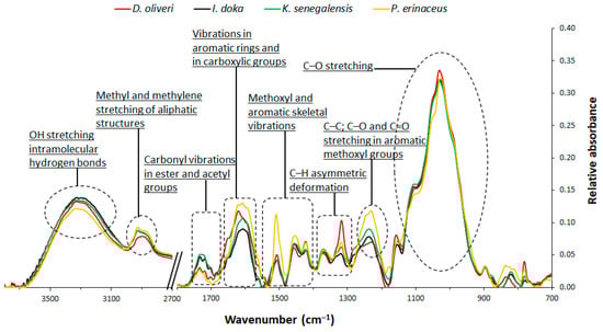 Average FTIR absorption spectra of the studied wood species, indicating the related bond vibrations for FTIR absorption bands.
