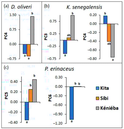 Bar chart of the mean values of component scores of PCA factors showing significant differences between samples from the three areas; (a) for D. oliveri (n = 5 for Kita, n = 6 for Sibi and n = 6 for Kéniéba), (b) for K. senegalensis (n = 8 for Kita, n = 8 for Sibi and n = 8 for Kéniéba), and (c) for P. erinaceus (n = 6 for Kita, n = 5 for Sibi and n = 6 for Kéniéba); (the labels a, ab, and b refer to group classification in ascending order of the Student–Newman–Keuls post-hoc test).