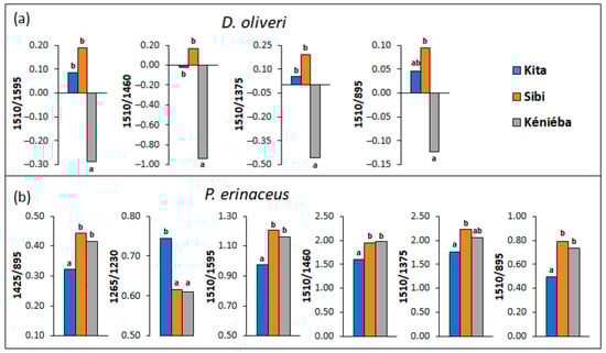 Bar chart of the mean values of FTIR ratios showing significant differences between samples from the three areas; (a) for D. oliveri (n = 5 for Kita, n = 6 for Sibi and n = 6 for Kéniéba), (b) for P. erinaceus (n = 6 for Kita, n = 5 for Sibi and n = 6 for Kéniéba); (the labels a, ab, and b refer to group classification in ascending order of the Student–Newman–Keuls post-hoc test).