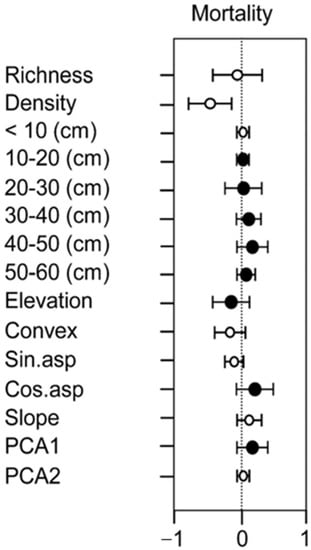 The effects of abiotic factors (soil properties and topography) and biotic factors (species richness and the number of stems within different DBH ranges) on tree mortality were assessed in the model. The results show that tree size was the most important factor determining tree mortality. In addition, tree mortality was significantly influenced by soil properties during the census years. Aspect had a significant positive effect on tree mortality, while elevation had a negative effect. Richness and density also had negative effects on tree mortality, but not significantly (Figure 3).