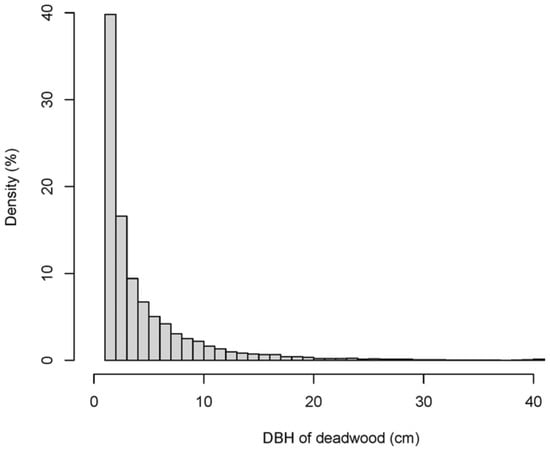 The deadwood biomass storage (DBd) ranged from 0.022 t ha−1 to 4.3 t ha−1, with a mean value of 0.3 ± 0.01 t ha−1 among the 500 subplots. Though the deadwood stems with <10 cm DBH dominated all stands, the DBd was significantly greater (p < 0.05) in the small and medium diameter classes (10–30 cm and 30–50 cm) (Table 1). The large stem class had the least DBd (2.5 t ha−1) due to its low abundance.