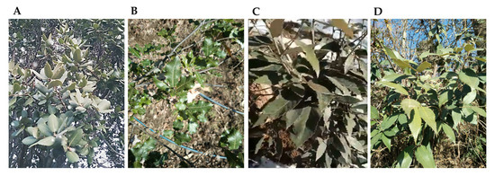 Representation of leaves of some oak species in Pakistan: (A) Q. baloot Griff., (B) Q. dilatata Royle., (C) Q. glauca Thunb., and (D) Q. incana Roxb. The photos were provided by Muhammad Khalil Ullah Khan.