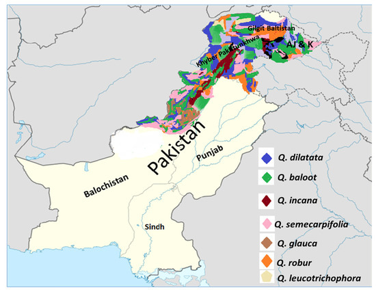 In more detail, in Khyber Pakhtunkhwa province, the major Quercus forests (Sheshikoh, Qalagay, Lalko, Manja, Sarbala, etc.) can be found in the Malakand Division (Swat, Dir lower and upper, Chitral, and Kohistan) and Hazara Division (Balakot, Sangar, and Kaghan), which form Pakistan’s basic forests: tropical dry deciduous forest, dry subtropical broad-leaved forests, subtropical pine forest, Himalayan moist temperate forests, Himalayan dry temperate forests, and subalpine forest, etc. [16,37]. Similarly, Tirah, Kurram Agency, Murree Hills, and Azad Kashmir are among the locations where Q. incana can be found [15,16,38]. It can also be found in the Swabi district of Khyber Pakhtunkhwa province [14,16,17,19,38]. However, Quercus spp. are not represented in the provinces of Balochistan, Sindh, and Punjab (Figure 3).