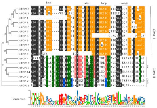 The alignment analysis showed that Jc TCPs shared high homology in the TCP domain (Figure 2). The TCP domain in Jc consisted of 55–60 amino acids that were involved in the basic helix–loop–helix (bHLH) structure. A comparison of TCP domains and a dendrogram showed that the 18 Jc TCP proteins could be classified into two subfamilies. In the two subfamilies, Class I contained 11 genes, and Class II contained 7 genes, respectively. In addition, the Class II subfamily was distinguished into two subclades, CYC/TB1 and CIN. The CYC/TB1 subclade contained two Jc genes, Jc TCP 7 and Jc TCP, while CIN included five members, Jc TCP 3, Jc TCP 4, Jc TCP 12, Jc TCP 13, and Jc TCP 14.