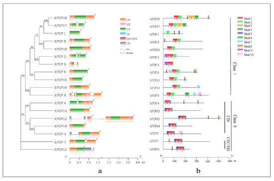 A new phylogenetic tree of Jc TCP genes was constructed, as well as an analysis of their conserved motif and exon/intron structure (Figure 2). Only Jc TCP 3, Jc TCP 12, and Jc TCP 11 contained UTR structure in the Class Ⅱ subfamily, while the others had no UTR (Figure 3a). Among the TCP genes of Jatropha, nine genes contained introns, and the number of introns varied from one to three. In the Class I subfamily, only four TCP genes (Jc TCP 2, Jc TCP 5, Jc TCP 9, Jc TCP 17) contained introns, accounting for 36.36%. In the Class Ⅱ subfamily, two genes (Jc TCP 13 and Jc TCP 14) had no introns, while the others had one to three introns.
