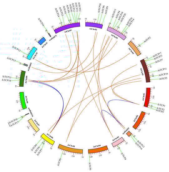 The annotation information of the genome, according to Jc, the retrieved TCP gene, was localized to the 11 chromosomes of the Jc. The TBtools tool [49] was used to analyze duplication events among the identified Jc TCP genes.
