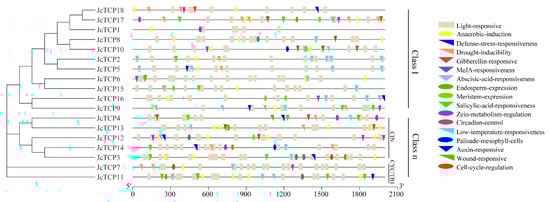 The 18 identified TCP genes were subjected to chromosome localization analysis, and the results are shown in Figure 4. Except for JcTCP13, JcTCP14, JcTCP15, JcTCP16, JcTCP17, and JcTCP18, all the other genes were accurately located on 10 chromosomes, with the number of TCP genes per chromosome ranging from 0 to 3. JcChr 01 and JcChr 06 contained three genes, JcChr 09 contained two genes, JcChr 03, JcChr 04, JcChr 05, and JcChr 10 contained one gene, while no TCP gene was found on JcChr 02, JcChr 07, JcChr 08, and JcChr 11 (Figure 4).