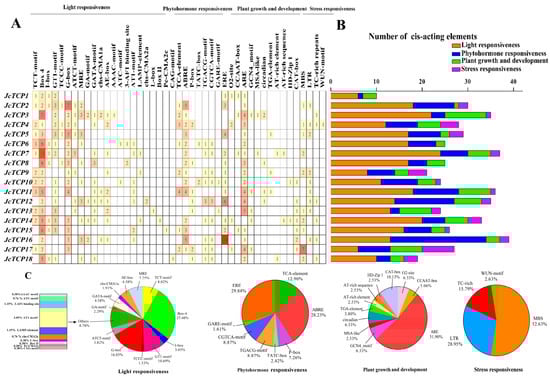 Statistical analysis of promoter components for TCP genes in Jctropha curcas L. (A) Statistical heat map of the number of promoter elements of 18 TCP genes in Jctropha curcas L., (B) Statistical map of the number of classified promoter elements of 18 TCP genes in Jctropha curcas L., (C) The characteristics of several major functional classes of Jc TCP gene promoter region.