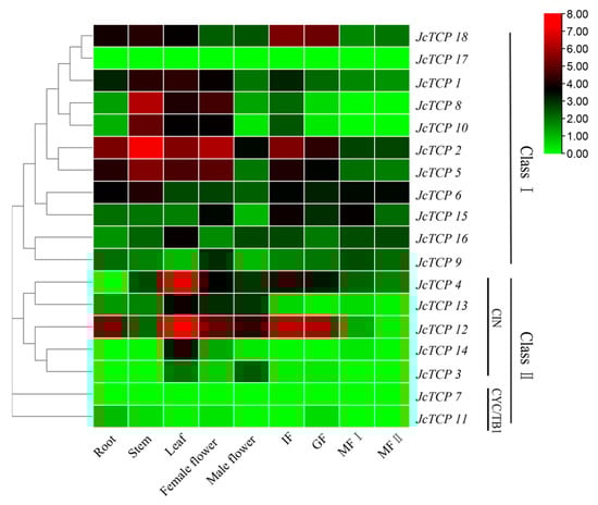 The publicly available transcriptome data were used to explore the expression profiles of 18 Jc TCP genes in various Jatropha organs (roots (SRR5974855), stems (SRR5974856), leaves (SRR5974846), female flowers (SRR5974844), male flowers (SRR5974843), immature fruits (IF) (SRR5974841), semi-mature seeds (SRR5974842), mature seeds (yellow, MFI, SRR5974857), and mature seeds Ⅱ (black-brown, MFⅡ, SRR5974858) under normal growth conditions (Figure 8 and Table S7). According to the retrieved data, two genes, namely Jc TCP 17 and Jc TCP 7, had no available expression information from the transcriptome profiling (Figure 8). In contrast, most of the remaining 18 Jc TCPs were differentially expressed in the examined organs. For example, Jc TCP 2 and Jc TCP 5 showed specific expression in several organs at different developmental stages, as their transcripts were strongly detectable in roots, stems, leaves, female flowers, and immure fruits, weakly expressed in male flowers and gold fruits, and unnoticed in mature fruits. Conversely, Jc TCP 12 was strongly expressed in leaves but very weakly expressed in mature fruits, whereas Jc TCP 8 was strongly expressed in stems but was not detected in mature fruits (Figure 7). Six genes (Jc TCP 1, Jc TCP 4, Jc TCP 12, Jc TCP 13, Jc TCP 14, and Jc TCP 16) were noted to more strongly express in leaves than other organs, suggesting that these genes played important roles in the development of leaves. Taken together, our analysis of these transcriptome data suggested that Jc TCP TFs had different regulatory functions on the growth and development of various organs during the Jc life cycle.