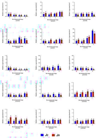 Analysis of TCP gene expression in Jn and Jc leaves. The different lowercase letters indicate that the same TCP gene at the same developmental stage showed a significant difference in gene expression levels between the Jc and Jn leaves.