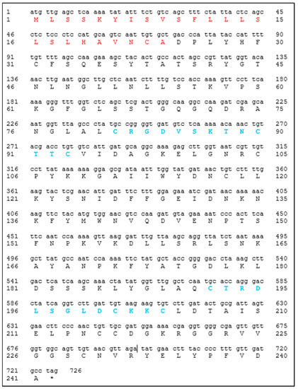 The designed primers for the amplification of the Cast_Gnk2-like coding sequence were 5′–CTCCATATGgctgacccattataccatttttgttttag–3′ and 5′– CACGGATCCctaggcatcaacaaaggggta–3′. The PCR was performed using Phusion™ High-Fidelity DNA Polymerase (2 U/µL) according to the manufacturer protocol. The vectors used for the construction were pET15b and pET28a (Novagen®, Gujarat, India), which carry an N-terminal or an N- and C- terminal oligo-histidine tag (6x His-tags), respectively. The DNA sequence encoding Cast_Gnk2-like was inserted into the vectors between NdeI and BamHI sites. Control plasmids were constructed without the Cast_Gnk2-like fragment. It is expected to observe a protein fraction (a band in the gels) in the region of 25 kDa. The size of the Cast_Gnk2-like coding sequence is represented in Figure 1 (726 bp).