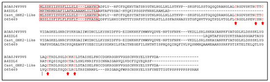 Ginkbilobin-2 protein from G. biloba (GNK2) was the most thoroughly characterized so far. It has one conserved cysteine motif (C-8X-C-2X-C) related to its antimicrobial action [8]. We detected two cysteine motifs in Cast_GNK2-like (Figure 1). The same occurs with A. thaliana CRK9 and C. mollissima A0A8J4V9V8 (Table 1, Pfam column). As expected, the protein with the highest similarity to Cast_GNK2-like is A0A8J4V9V8 (99.6%, E-value 3.3 × 10−180) from the Chinese chestnut. Additionally, the amino acid sequences of all the proteins start with a signal peptide that guides the final peptide to the apoplast (Table 1). The alignment of the four amino acid sequences also indicates that all the proteins have a signal peptide for the protein to be secreted. Moreover, the alignment shows the existence of one conserved cysteine motif for GNK2 and two motifs for Cast_GNK2-like, as A0A8J4V9V8 and CRK9 (Figure 2).