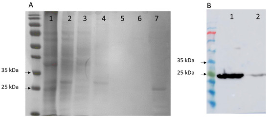 The results of the recombinant protein expression, following different conditions to optimize the process, showed (according to the electrophoresis gels, SDS-PAGE) that the best expression was obtained using the E. coli BL21 (DE3) pLysS, in plasmid pET15, for 16 h at 20 °C, using 1 mM IPTG. We could observe a band in the gels (a protein fraction) in the region of 25 kDa (Figure 3A).