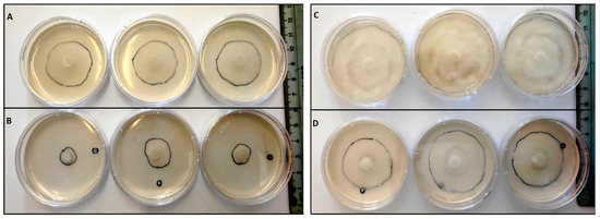 Mycelia of P. cinnamomi growth in PDA medium under different conditions (3 Petri plates out of n are shown as representative of the assay). (A): Control treatment with buffer solution and P. cinnamomi mycelial growth after 24 h. (B): Cast_Gnk2-like pure protein (250 µL/plate and 0.5 mg/mL) and P. cinnamomi mycelial growth after 24 h. (C): Control treatment with buffer solution and P. cinnamomi mycelial growth after 48 h. (D): Cast_Gnk2-like pure protein (250 µL/plate and 0.5 mg/mL) and P. cinnamomi mycelial growth after 48 h.