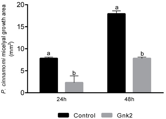 The mycelia area (cm2) of P. cinnamomi growth in PDA medium under control treatment was 7.8 cm2, while in Cast_Gnk2-like pure protein treatment (0.5 mg/mL), it was 2.3 cm2, after 24 h. Cast_Gnk2-like pure protein treatment reduced the P. cinnamomi growth area by more than 100%. The same pattern was found after 48 h of incubation (Figure 5).