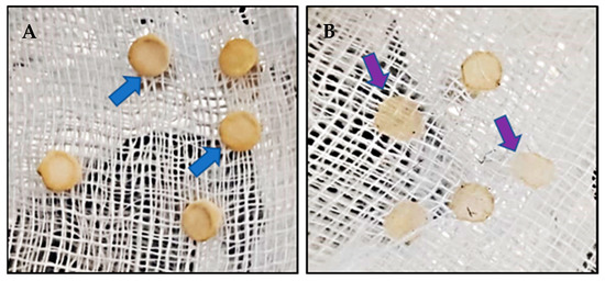 Phytophthora cinnamomi mycelia dried (after 24 h at 65 °C) on PDA plugs (5 mm diam.) grown in potato dextrose liquid medium (50 mL) for 48 h in shaking (180 rpm) at 25 °C. Some of n plugs are shown as representative of the assay. (A): Control treatment (only with buffer solution), and (B): Cast_Gnk2-like pure protein treatment (250 µL and 0.5 mg/mL).