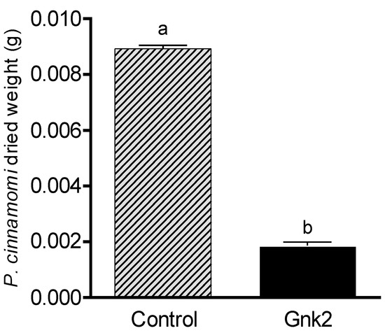 Mycelial dry weight (g) of P. cinnamomi growth in potato dextrose liquid medium (50 mL) under control treatment (only with buffer solution) and Cast_Gnk2-like pure protein treatment (250 µL and 0.5 mg/mL) after 48 h in shaking (180 rpm) at 25 °C. Results are shown as means ± SEM. Significant differences are shown as different letters (t-test, p < 0.05).