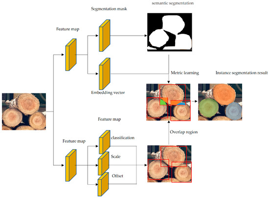 In order to improve the performance of the instance segmentation method in the log check path, a fast instance segmentation method based on metric learning is proposed in this paper. As shown in Figure 1, the method extracts the mask image, rectangular box prediction map, and embedding vector map of the image using a convolutional neural network. The mask image is used to extract log end regions, and the rectangular frame prediction image generates an enveloping rectangular frame for each log, which in turn divides the log end regions into instances. For the overlapping regions of the rectangular box, a metric learning paradigm is used to increase the embedding vector distance between pixels located in different logs and decrease the embedding vector distance between pixels of the same log. Finally, the mask pixels of the overlapping regions of the rectangular box are instantiated according to the pixel embedding vectors to obtain the end face mask of each log. The contribution of this paper is summarized as follows:
