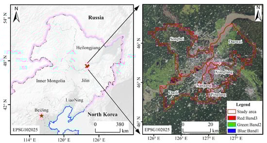 Harbin city (125°42′–130°10′ E, 44°04 N–46°40′ N) is the political, economic, and cultural center of the northeast of China. The mean annual temperature is 5.2 °C, which is characteristic of a continental monsoon climate. The surface soil is mainly chernozem soil, also referred to as “black earth”, which has rich nutrients and provides excellent conditions for both forests and crops. The urbanization of Harbin city began in 1978 and it had a gross domestic product (GDP) of RMB 535 billion in 2021, an increase of 367 billion over 2004. With the greatest geographical area among all provincial cities in China, Harbin has a total population of over 10 million people, representing approximately 31% of the population of Heilongjiang Province [35]. Our study area includes six districts comprising the urban area of Harbin city, distributed as shown in Figure 1.