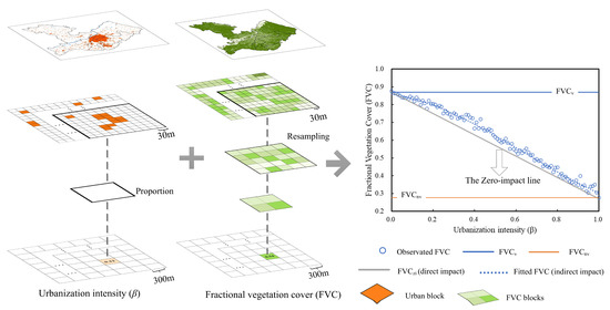 A conceptual framework proposed by [23] was generated to quantify the direct and indirect impacts of urbanization on vegetation growth. Here, the direct impacts refer to the impacts of LUCC on vegetation growth in a city during urban expansion. Theoretically, the FVC is inversely proportional to the urban ratio (β, also called “urban intensity”), and we assumed that there is a linear relationship between FVC and β when only direct effects are considered. Hence, the theoretical zero-impact straight line was determined by two FVC values of fully vegetated and fully urbanized pixels, as shown in Equation (5),
