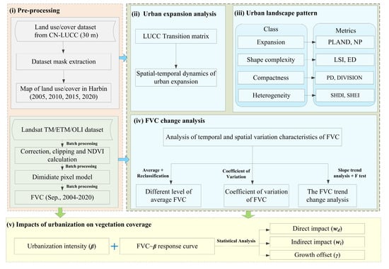 The steps and sequences of data collection and analysis used in the study are shown in Figure 3. The flowchart has five parts, including pre-processing, urban expansion analysis, urban landscape pattern, FVC change analysis, and impacts of urbanization on vegetation coverage. The FVC change analysis and impacts of urbanization on vegetation coverage were performed using Python 3.6 with the numpy, pandas, gdal, and statsmodels packages.