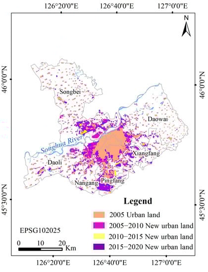 According to the dataset of land use in 2005, 2010, 2015, and 2020, the urban land in Harbin was mostly distributed on the south side of the Songhua River (Figure 4). The change in urban expansion of Harbin city over the past 15 years showed that the built-up area of Harbin expanded relatively quickly between 2005 and 2010, and even faster between 2015 and 2020, which demonstrates the rapid economic growth.