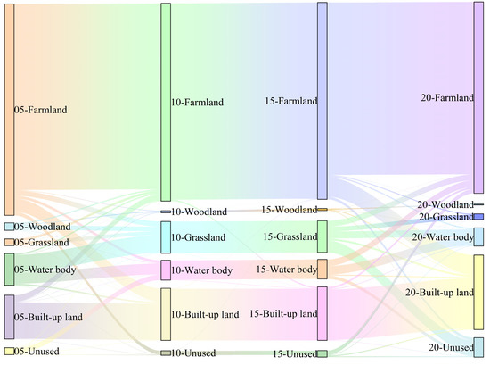 Sankey diagram of the land cover transfer in three-time intervals in Harbin 2005–2020. The rectangular shape refers to transfer between land use types, and the thickness of the curve represents the amount of transfer. The year is indicated by the number before the land use name, where 05 is 2005, 10 is 2010, 15 is 2015, and 20 is 2020.
