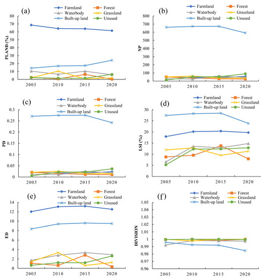 Changes in landscape pattern metrics of (a) PLAND; (b) NP; (c) PD; (d) LSI; (e) ED; (f) DIVISION from 2005 to 2020.