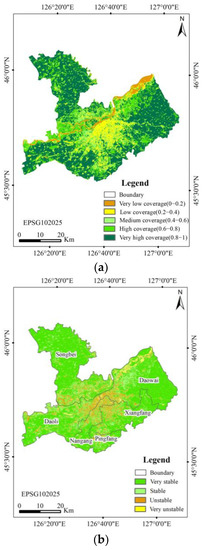 The annual average FVC in Harbin ranges between 35.57%~47.41%, and vegetation coverage varies regionally (Figure 7a). The overall spatial distribution of FVC in Harbin exhibits that the urban fringe region is obviously higher than the central region. The average FVC in the Nangang district is 0.39, consisting mainly of extremely high grade and low grade, occupying 40.14% and 22.68% of its area, respectively. The highest average FVC in the Pingfang district is 0.81, which is mainly extremely high grade and high grade, taking up 49.46% and 23.56% of its area, respectively. Overall, the very high grade accounts for the largest area proportion, which fills about 50.98% of Harbin’s area, mainly distributed in the Songbei and Daowai districts (424.22 km2 and 322.98 km2), while it has the least distribution in the Pingfang district (48.85 km2).