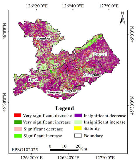 Combining the linear regression slope method and F test, the spatial pattern and variability of vegetation coverage can be described to reflect the FVC trends. From 2004 to 2020, the variation trends of FVC ranged from −0.05~0.06. A decreasing trend in vegetation cover was noted in most areas of Harbin (Figure 8), with an extremely significant decrease in about 142.78 km2, accounting for 5.85% of Harbin’s land (p < 0.01). Insignificantly decreased vegetation coverage (p > 0.05) accounted for the largest area (1281.26 km2, approximately 52.47%), and was more evenly distributed in each district, taking up about half of each district’s land. In the contract, the regions with increased vegetation coverage only accounted for 31.53%. The regions where FVC significantly increased comprise only 7.48% of Harbin’s area (p < 0.05), which was mainly found in the southern part of the Songbei and northern Daowai districts, and least in the Nangang district. Additionally, the stable vegetation coverage change area of 3.01% was mainly distributed in the main urban area, with an area of about 73.44 km2. In general, most regions exhibited insignificant FVC changes, accounting for 76.51%. Significant changes were mainly found in the interior of the Pingfang district and along the Songhua river in the Daowai district (Figure S1).